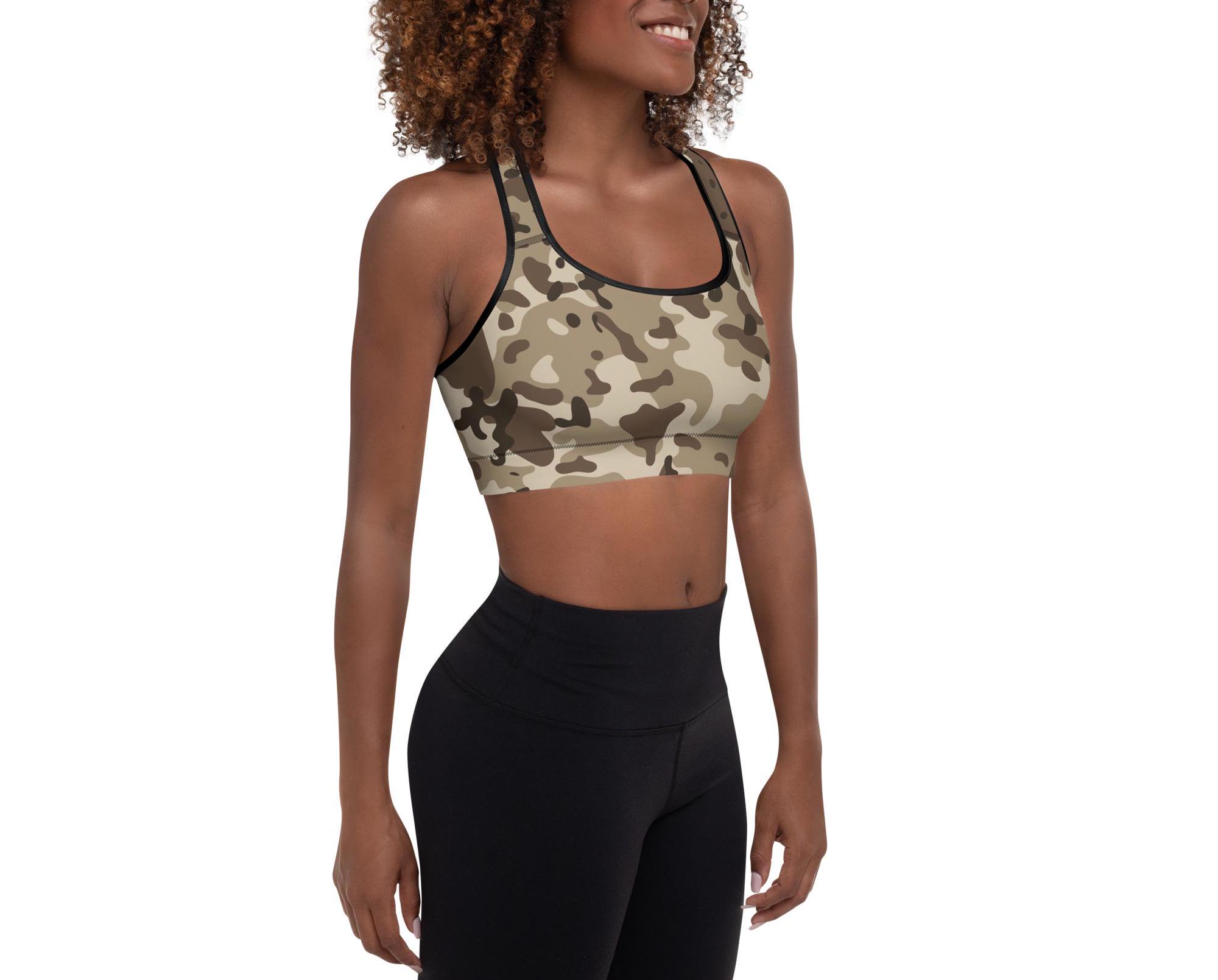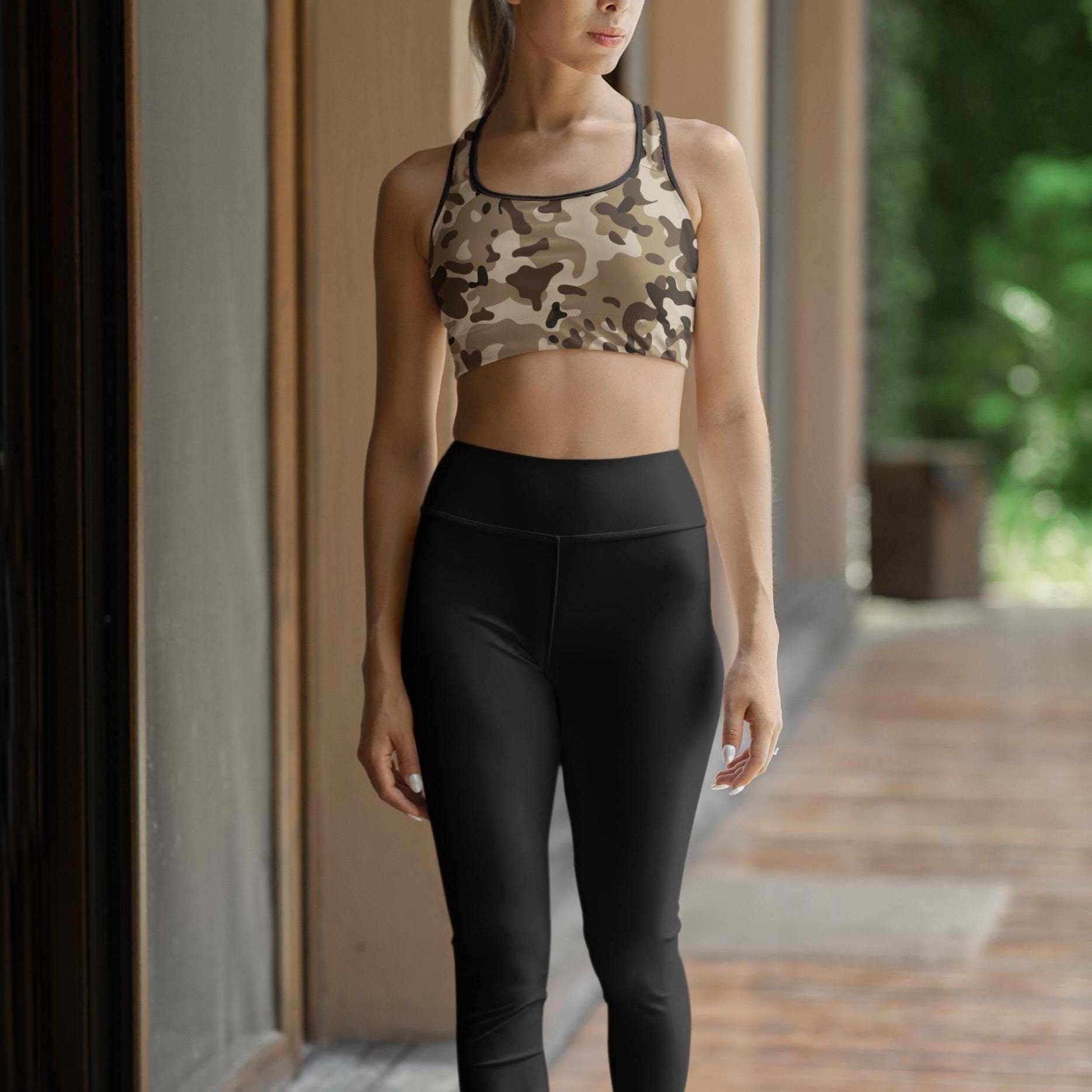 Embrace comfort, style, and performance with our Khaki Camo SportsBra. This Women’s Yoga SportsBra harmoniously blend style and practicality. Relish unrestricted comfort whether you’re engaged in workouts, yoga, or leisurely pursuits. High Resolution imagery is printed directly to the fabric when you order, then we cut them and our sew them making a unique and Beautiful Sportsbra with vibrant colors and a soft touch – perfect for any Workout, Yoga or casual occasion.